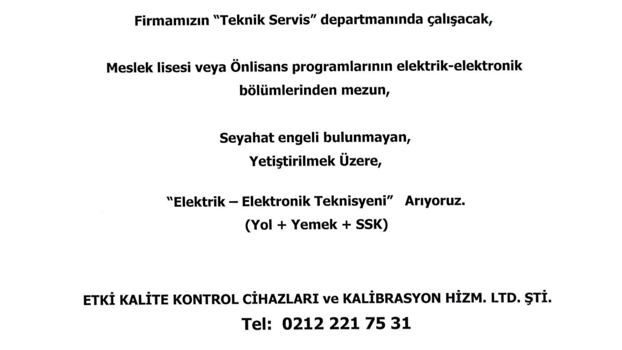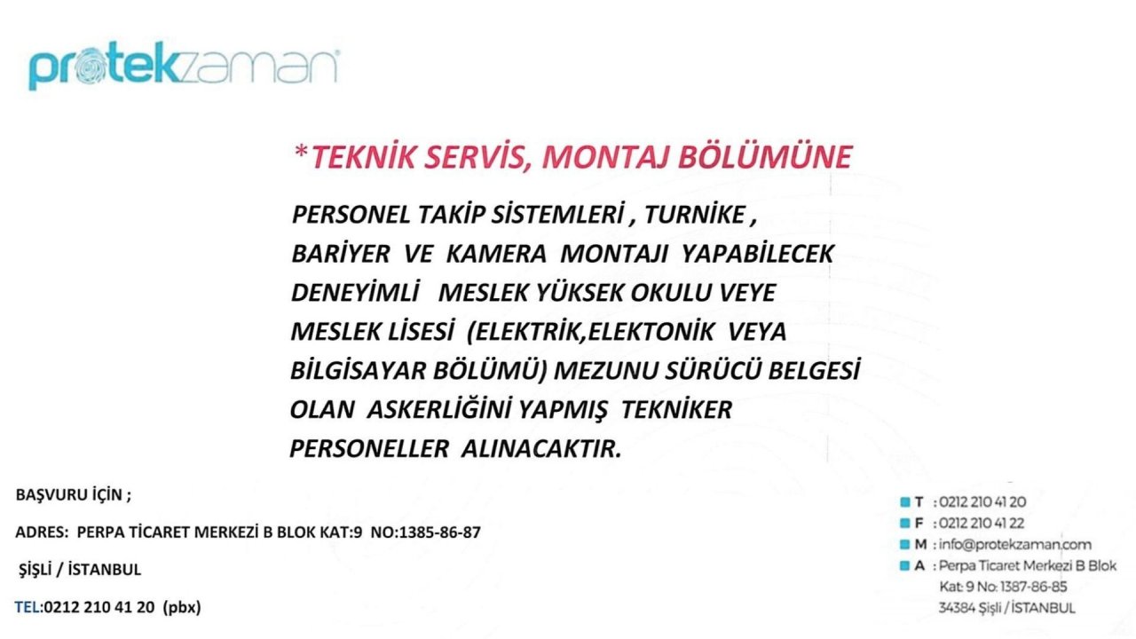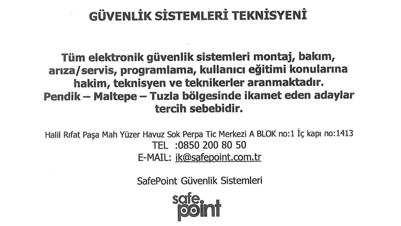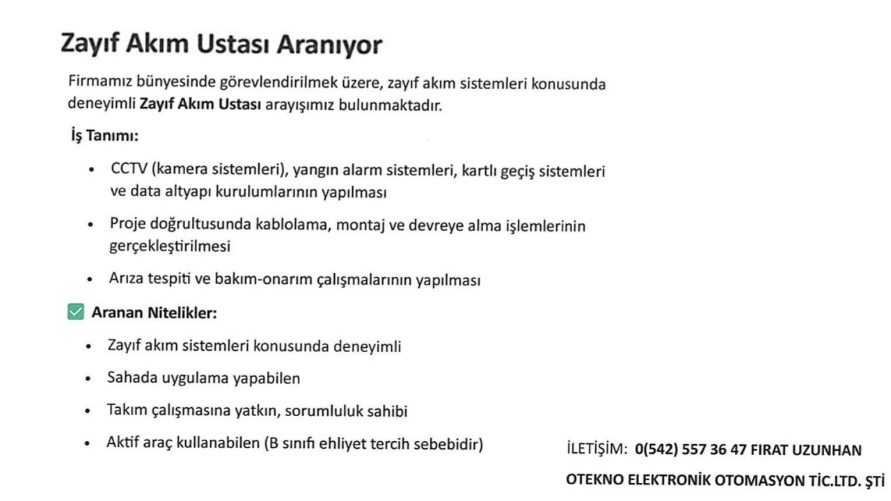 DetayElektronik güvenlik sistemlerinde montaj, bakım, arıza/servis, programlama ve kullanıcı eğitimi konularına hâkim Saha kurulumlarında kablolama, devreye alma, test ve arıza tespiti yapabilen Müşteri sahasında iletişimi güçlü, çözüm ve sonuç odaklı çalışabilen Takım çalışmasına uyumlu, iş disiplinine sahip, raporlama yapabilen (Tercihen) CCTV, IP kamera, NVR/DVR, alarm, kartlı geçiş, turnike, bariyer, yangın algılama sistemlerinde deneyim (Tercihen) MYO/meslek lisesi Elektrik-Elektronik/BT mezunu (Tercihen) B sınıfı ehliyet ve aktif araç kullanımı, şehir içi saha çalışmalarına uygunluk