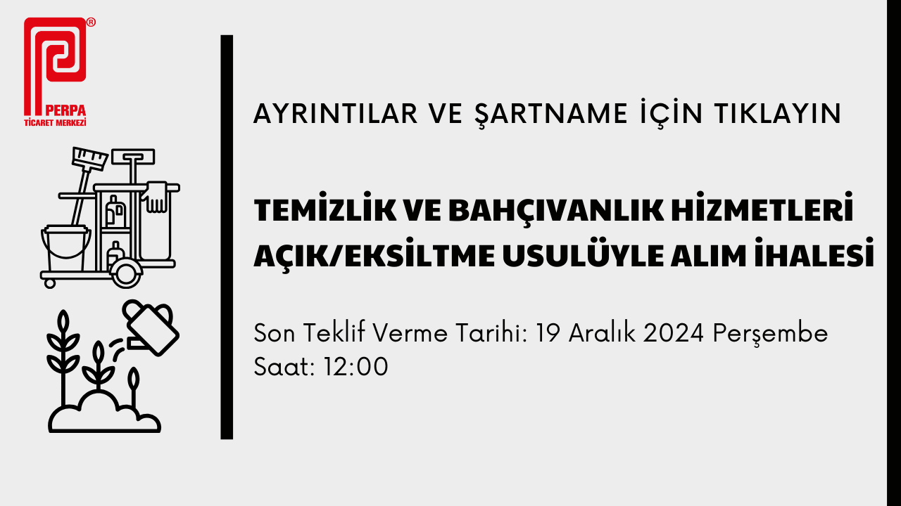 Perpa Ticaret Merkezi B Blok 11. ve 12. katlardaki 4 no'lu 1 adet kadın WC ile 4 no'lu 1 adet erkek WC’nin bu sayfanın altında yer alan sözleşme, proje, idari ve teknik şartnamelere uygun şekilde, malzeme ve işçilik dahil anahtar teslim usulü ile götürü bedel anahtar teslimi fiyat esasında yapılması işi için ihaleye çıkılacaktır.