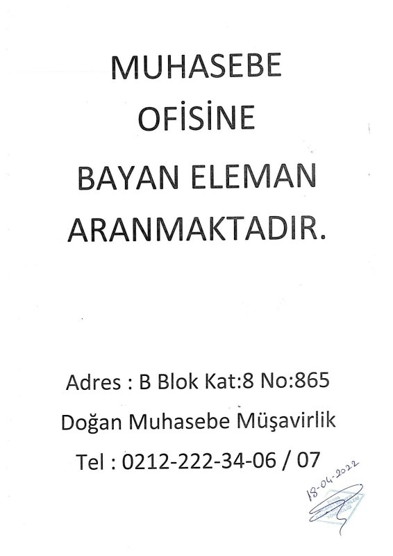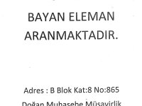 MUHASEBE OFİSİNE BAYAN ELEMAN ARANMAKTADIR. ADRES: PERPA TİCARET MERKEZİ B BLOK KAT: 8 NO: 865 DOĞAN MUHASEBE MÜŞAVİRLİK TEL: 0212 222 34 06 / 07