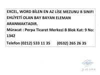 EXCEL, WORD BİLEN EN AZ LİSE MEZUNU B SINIFI EHLİYETİ OLAN BAY BAYAN ELEMAN ARANMAKTADIR. ADRES: PERPA TİCARET MERKEZİ B BLOK KAT: 9 NO: 1342 TELEFON: 0212 533 11 35 / 0532 265 26 35