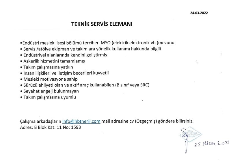 ÇALIŞMA ARKADAŞLARIN info@hbtnerji.com MAİL ADRESİNE CV GÖNDEREBİLİRLER.