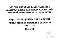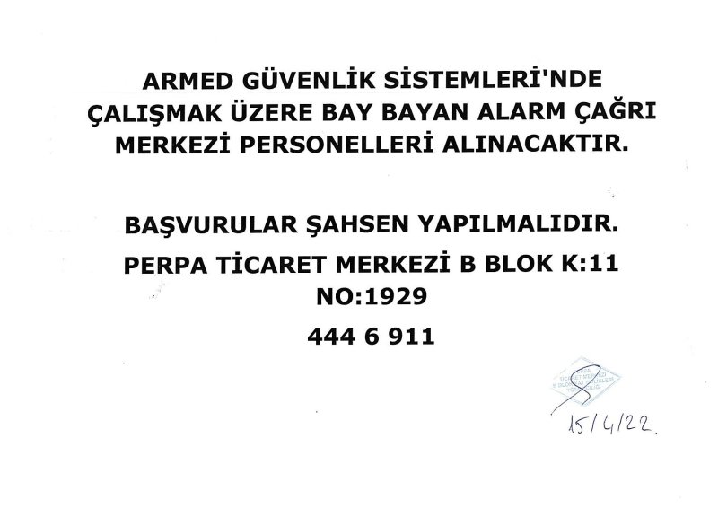 ARMED GÜVENLİK SİSTEMLERİ’NDE ÇALIŞMAK ÜZERE BAY BAYAN ALARM ÇAĞRI MERKEZİ PERSONELLERİ ALINACAKTIR. BAŞVURULAR ŞAHSEN YAPILMALIDIR. ADRES: PERPA TİCARET MERKEZİ B BLOK K: 11 NO: 1929 TEL: 444 6 911