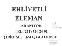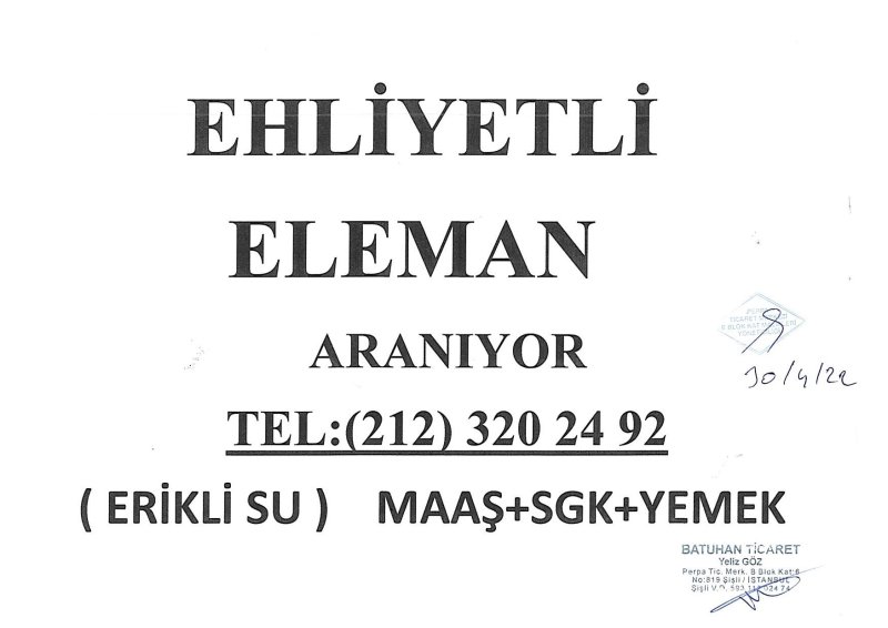 BATUHAN TİCARET (ERİKLİ SU) EHLİYETLİ ELEMAN ARANIYOR. MAAŞ+SGK+YEMEK ADRES: PERPA TİCARET MERKEZİ B BLOK KAT: 6 NO: 819 TEL: 0212 320 24 92