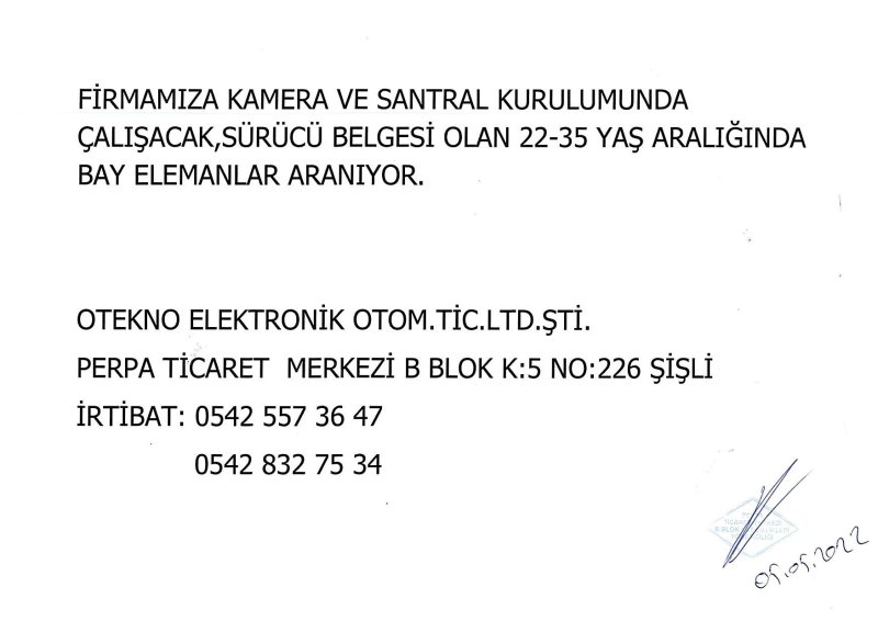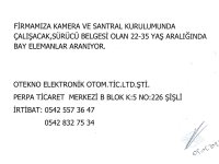 OTEKNO ELEKTRONİK OTOM.TİC.LTD.ŞTİ. FİRMAMIZA KAMERA VE SANTRAL KURULUMUNDA ÇALIŞACAK, SÜRÜCÜ BELGESİ OLAN 22-35 YAŞ ARALIĞINDA BAY ELEMANLAR ARANIYOR. ADRES: PERPA TİCARET MERKEZİ B BLOK KAT: 5 NO: 226 TEL: 0542 557 36 47 – 0542 832 75 34