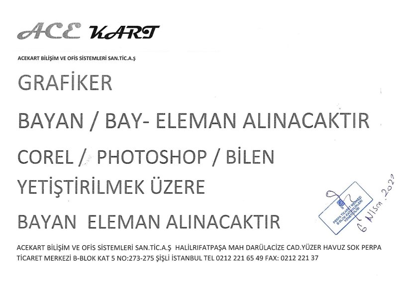 GRAFİKER BAYAN / BAY - ELEMAN ALINACAKTIR. COREL / PHOTOSHOP / BİLEN YETİŞTİRİLMEK ÜZERE BAYAN ELEMAN ALINACAKTIR. ADRES: PERPA TİCARET MERKEZİ B BLOK KAT: 5 NO: 273 - 275 TEL: 0212 221 65 49