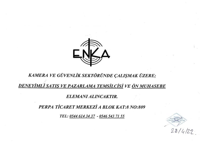 KAMERA VE GÜVENLİK SEKTÖRÜNDE ÇALIŞMAK ÜZERE; DENEYİMLİ SATIŞ VE PAZARLAMA TEMSİLCİSİ VE ÖN MUHASEBE ELEMANI ALINACAKTIR. ADRES: PERPA TİCARET MERKEZİ A BLOK KAT: 8 NO: 809 TEL: 0544 614 34 37 - 0546 543 71 55