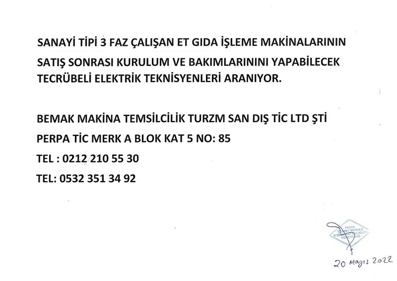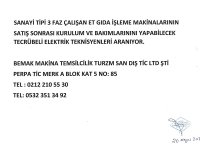 SANAYİ TİPİ 3 FAZ ÇALIŞAN ET GIDA İŞLEME MAKİNALARININ SATIŞ SONRASI KURULUM VE BAKIMLARINI YAPABİLECEK TECRÜBELİ ELEKTRİK TEKNİSYENİ ARANIYOR.