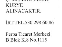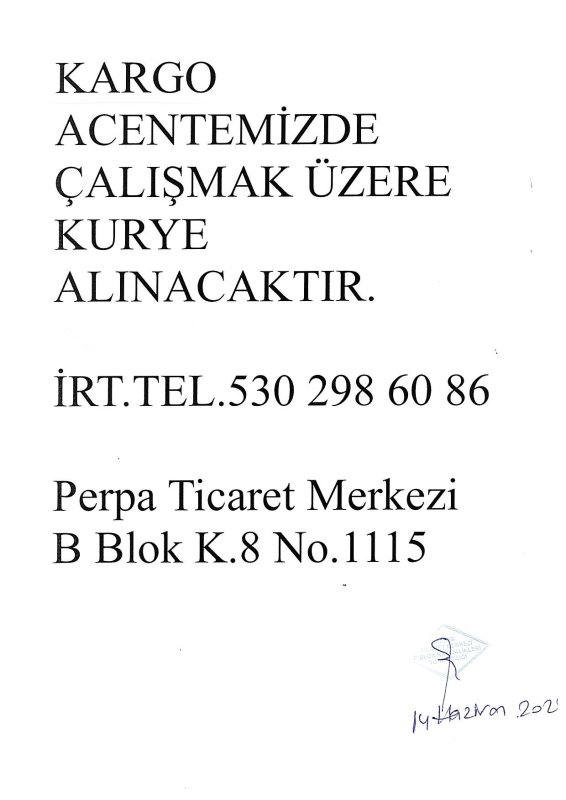 KARGO ACENTEMİZDE ÇALIŞMAK ÜZERE KURYE ALINACAKTIR. ADRES: PERPA TİCARET MERKEZİ B BLOK K: 8 NO: 1115 TEL: 0530 298 60 86