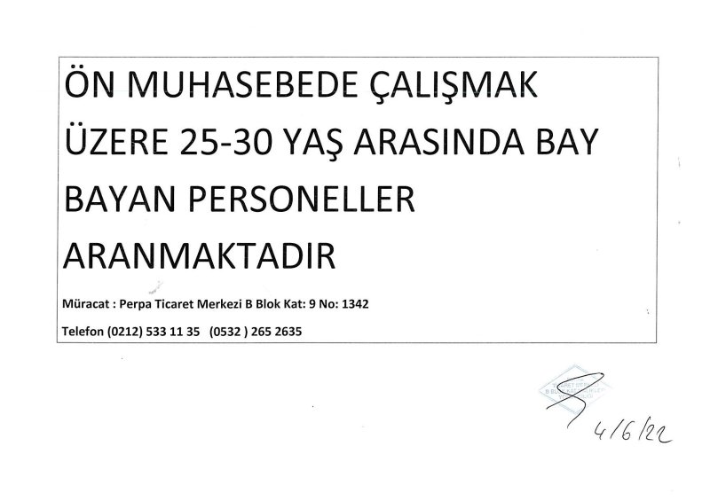 ÖN MUHASEBEDE ÇALIŞMAK ÜZERE 25 - 30 YAŞ ARASINDA BAY BAYAN PERSONELLER ARANMAKTADIR ADRES: PERPA TİCARET MERKEZİ B BLOK KAT: 9 NO: 1342 TEL: 0212 533 11 35 - 0532 265 26 35