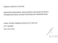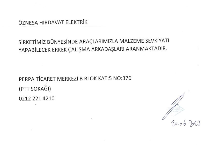 ÖZNESA HIRDAVAT ELEKTRİK ŞİRKETİMİZ BÜNYESİNDE ARAÇLARIMIZLA MALZEME SEVKİYATI YAPABİLECEK ERKEK ÇALIŞMA ARKADŞLARI ARANMAKTADIR. ADRES: PERPA TİCARET MERKEZİ B BLOK KAT: 5 NO: 376 TEL: 0212 221 42 10