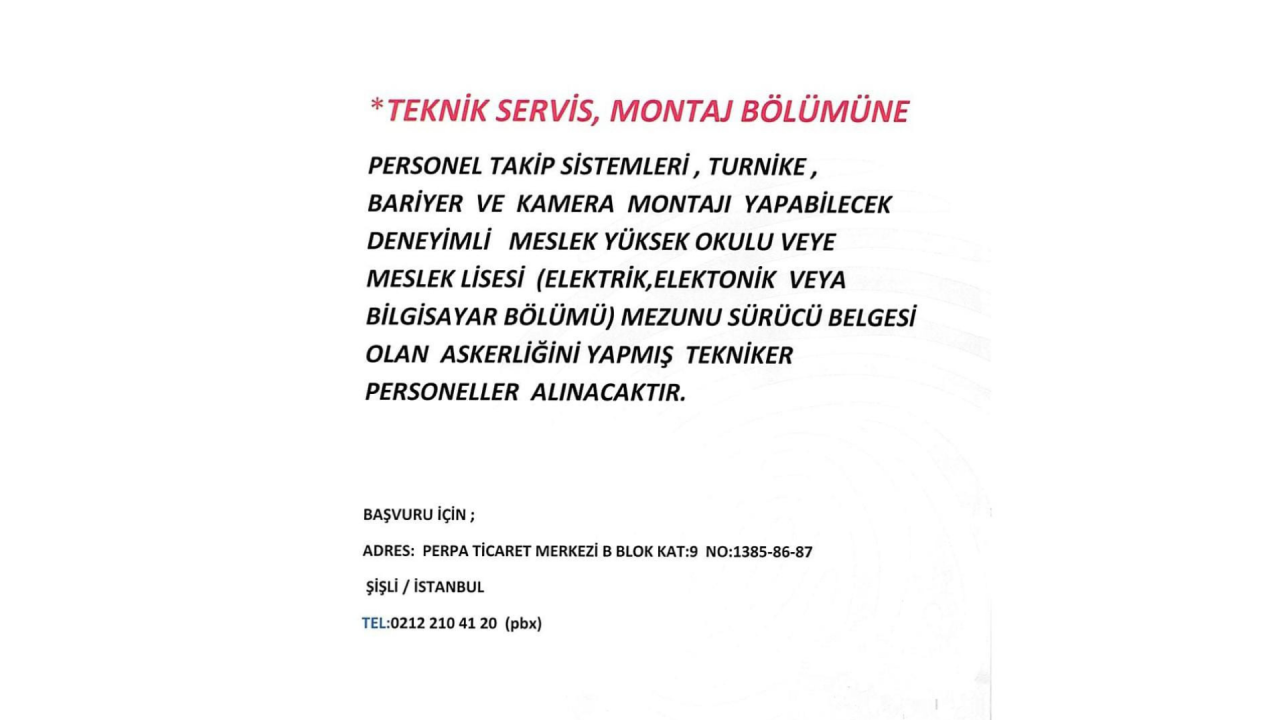 ŞİRKETİMİZDE TEKNİK SERVİS MONTAJ BÖLÜMÜNE, PERSONEL TAKİP SİSTEMLERİ, TURNİKE, BARIYER VE KAMERA MONTAJI YAPABİLECEK DENEYİMLİ MESLEK YÜKSEK OKULU VEYA MESLEK LİSESİ (ELEKTİRİK, ELEKTRONİK, BİLGİSAYAR BÖLÜMÜ) MEZUNU, SÜRÜCÜ BELGESİNE SAHİP, ASKERLİĞİNİ YAPMIŞ TEKNİKER PERSONELLER ARANMAKTADIR.