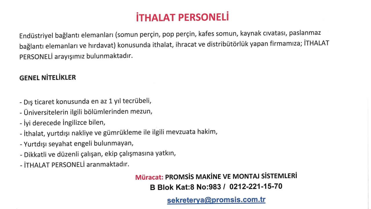 İTHALAT PERSONELİ ARANMAKTADIR.
