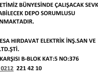 ŞİRKETİMİZ BÜNYESİNDE ÇALIŞACAK SEVKİYAT YAPABİLECEK DEPO SORUMLUSU ARANMAKTADIR.