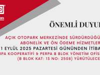 Açık Otopark Merkezinde sürdürdüğümüz abonelik ve ön ödeme hizmetlerimiz 1 Eylül 2025 Pazartesi gününden itibaren PERPA Kooperatifi & PERPA B Blok Yönetim Ofisi’nde (B Blok Kat 13 No:2508) yürütülecektir.