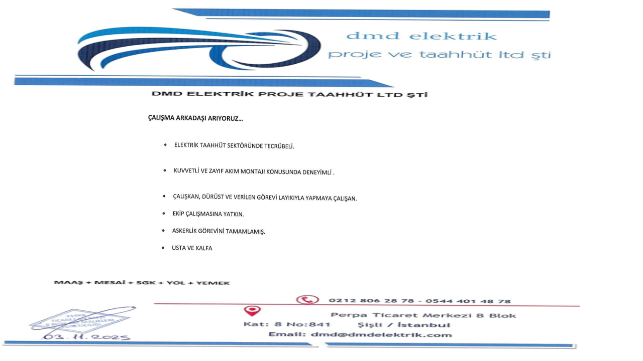 DMD Elektrik Proje Taahhüt Ltd. Şti. ekibine yeni çalışma arkadaşları arıyor.