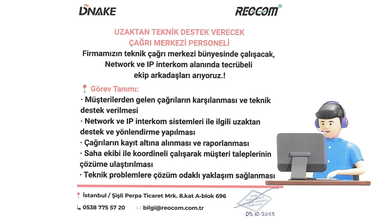 Firmamızın teknik çağrı merkezi bünyesinde çalışacak, Network ve IP interkom alanında tecrübeli ekip arkadaşları arıyoruz.