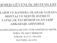ARMED GÜVENLİK SİSTEMLERİ ALARM VE KAMERA OLARAK SAHADA MONTAJ VE SERVİS HİZMETİ YAPACAK TECRÜBESİ OLAN EKİP ARKADAŞI ARIYORUZ ÇALIŞMA KOŞULLARI YÜZ YÜZE GÖRÜŞÜLECEKTİR. PERPA TİCARET MERKEZİ B BLOK KAT:11 NO:1929 İLETİŞİM: 444 6 911