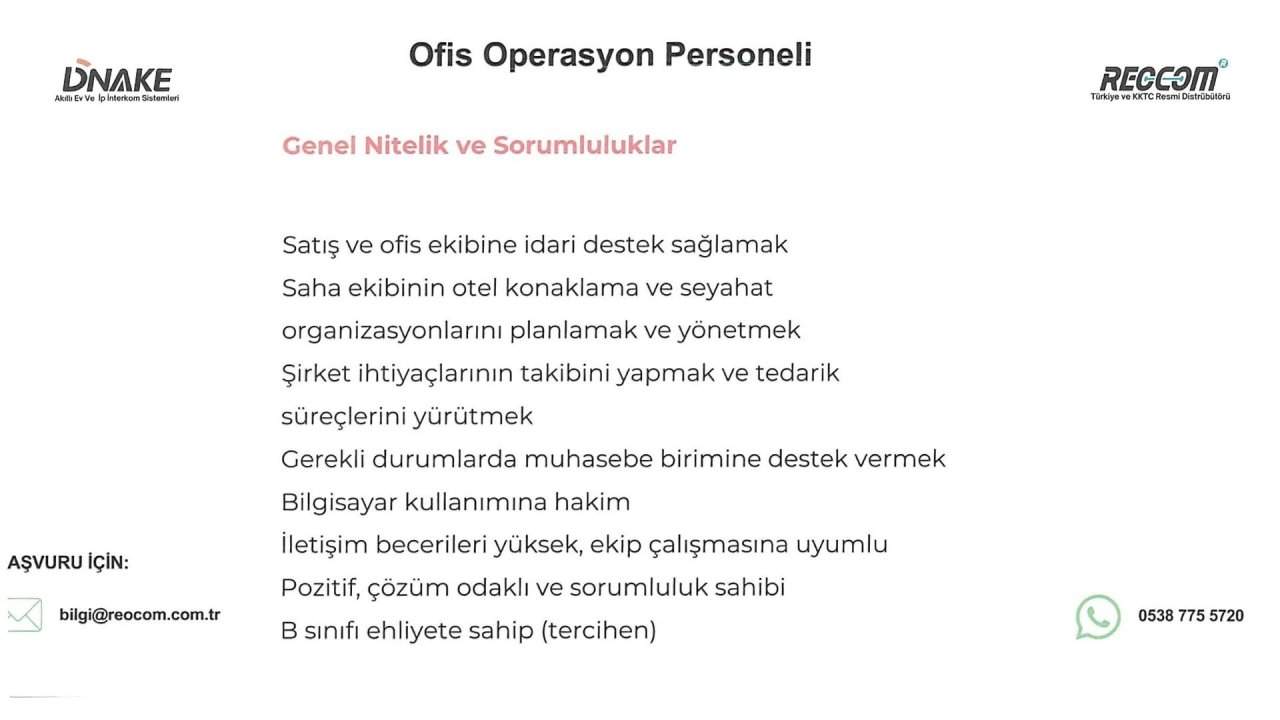Ofis Operasyon Personeli Aranıyor