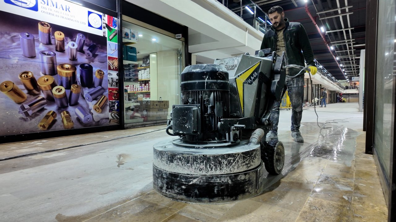 PERPA Ticaret Merkezi’nde ortak alanların yenilenmesine yönelik çalışmalar aralıksız devam ediyor.  5. katta mermer silim işlemlerinde son aşamaya gelindi