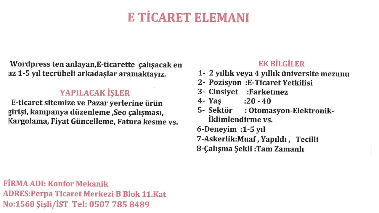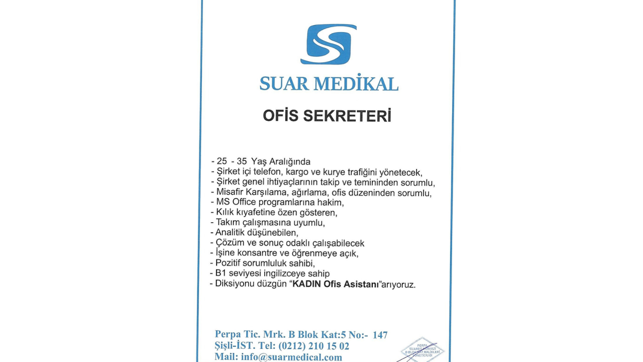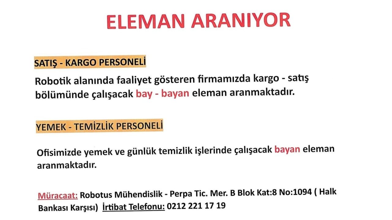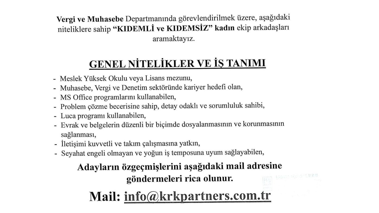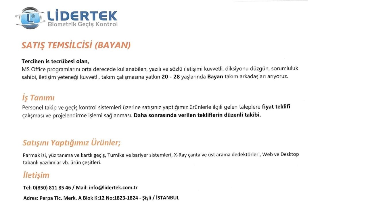 Detay25–35 yaş aralığında, şirket içi telefon–kargo trafiğini yönetebilecek, ofis düzeni ve misafir karşılama süreçlerinde deneyimli; MS Office programlarına hâkim, diksiyonu düzgün, B1 seviyesinde İngilizce bilen, takım çalışmasına uyumlu, analitik ve çözüm odaklı kadın ofis asistanı aranmaktadır.