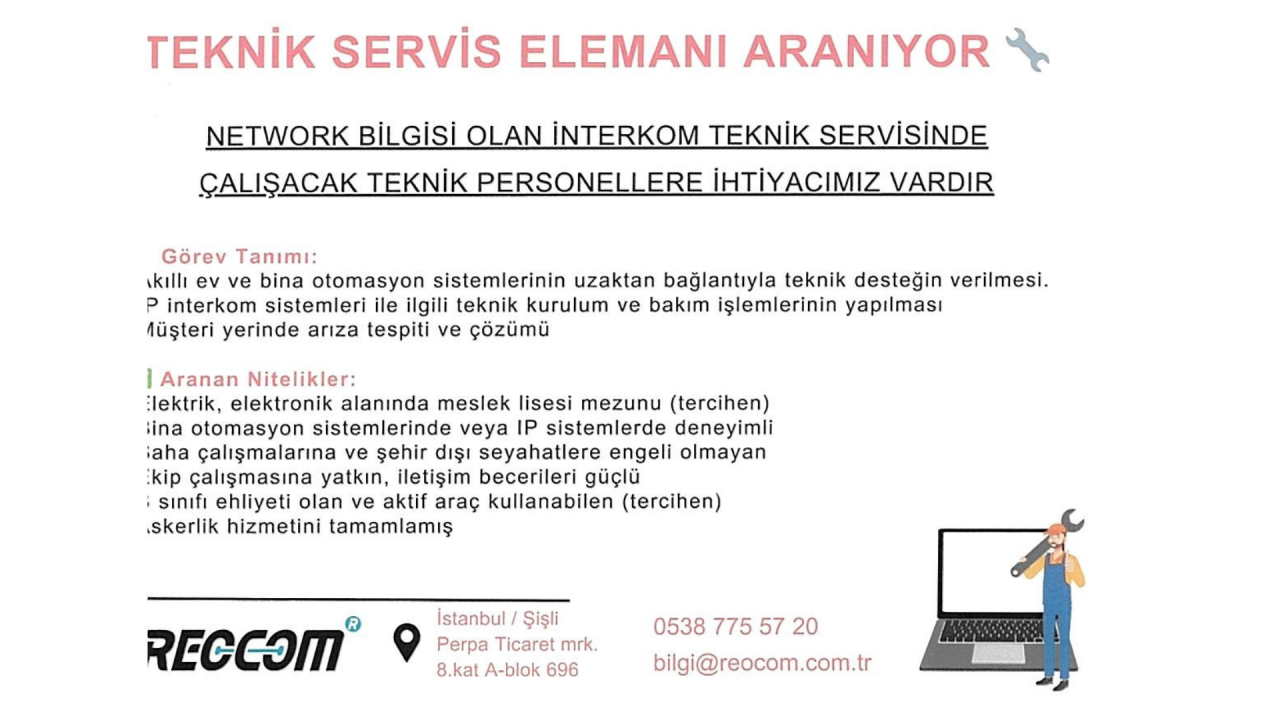 DetayReecom, network bilgisine sahip ve interkom teknik servisinde çalışacak teknik personel arıyor. Akıllı ev ve bina otomasyon sistemleri ile IP interkom sistemlerinde deneyimli, ekip çalışmasına uyumlu ve şehir dışı seyahat engeli olmayan adaylar tercih edilmektedir. Elektrik/elektronik alanında meslek lisesi mezunları önceliklidir.