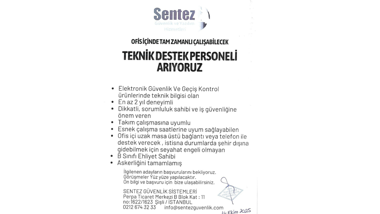 Sentez Güvenlik Sistemleri, elektronik güvenlik ve geçiş kontrol ürünlerinde teknik bilgi sahibi, ekip çalışmasına uyumlu, sorumluluk bilinci yüksek adaylar aramaktadır.