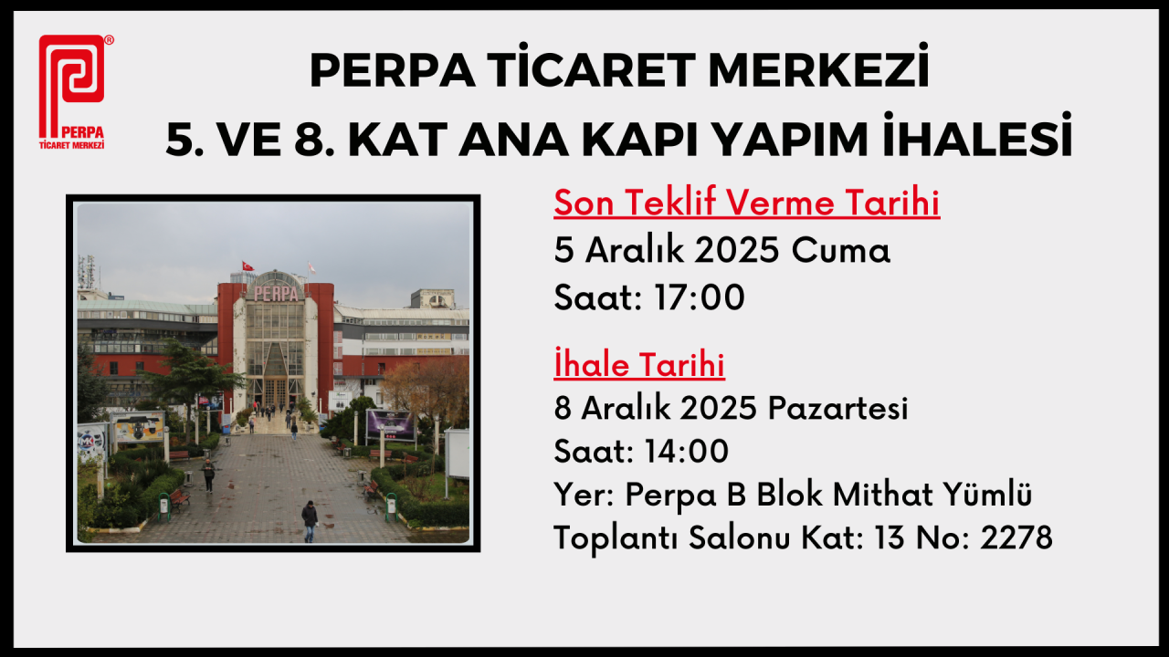 Perpa Ticaret Merkezi 5. ve 8. katlardaki ana giriş kapılarının yenilenmesi için ihaleye çıkılmıştır.