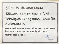 ŞİRKETİMİZİN ARAÇLARINI KULLANABİLECEK ASKERLİĞİNİ YAPMIŞ 25-40 YAŞ ARASINDA ŞOFÖR ALINACAKTIR.