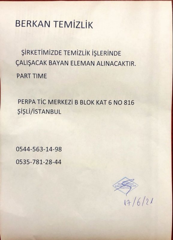 ŞİRKETİMİZDE TEMİZLİK İŞLERİNDE ÇALIŞACAK BAYAN ELEMAN ALINACAKTIR.