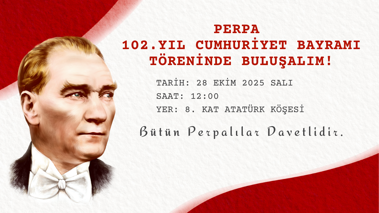 Cumhuriyetimizin 102. yılını kutlayacağımız Cumhuriyet Bayramı törenimiz 28 Ekim 2025 Salı günü saat 12:00'de PERPA 8. kat Atatürk Köşesinde yapılacaktır. Tüm Perpalılar ve ziyaretçilerimiz davetlidir.