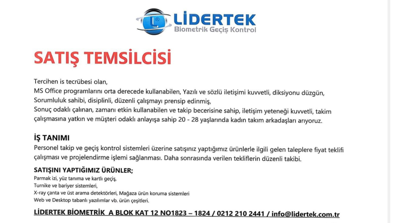 MS OFFICE PROGRAMLARINI ORTA DERECEDE KULLANABİLEN, YAZILI VE SÖZLÜ İLETİŞİMİ KUVVETLİ, DİKSİYONU DÜZGÜN, SORUMLULUK SAHİBİ, DİSİPLİNLİ, DÜZENLİ ÇALIŞMAYI PRENSİP EDİNEN, SONUÇ ODAKLI ÇALIŞAN, ZAMANI ETKİN KULLANABİLEN VE TAKİP BECERİSİNE SAHİP, İLETİŞİM YETENEĞİ KUVVETLİ, TAKIM ÇALIŞMASINA YATKIN VE MÜŞTERİ ODAKLI ANLAYIŞA SAHİP 20 - 28 YAŞLARINDA KADIN TAKIM ARKADAŞLARI ARIYORUZ.