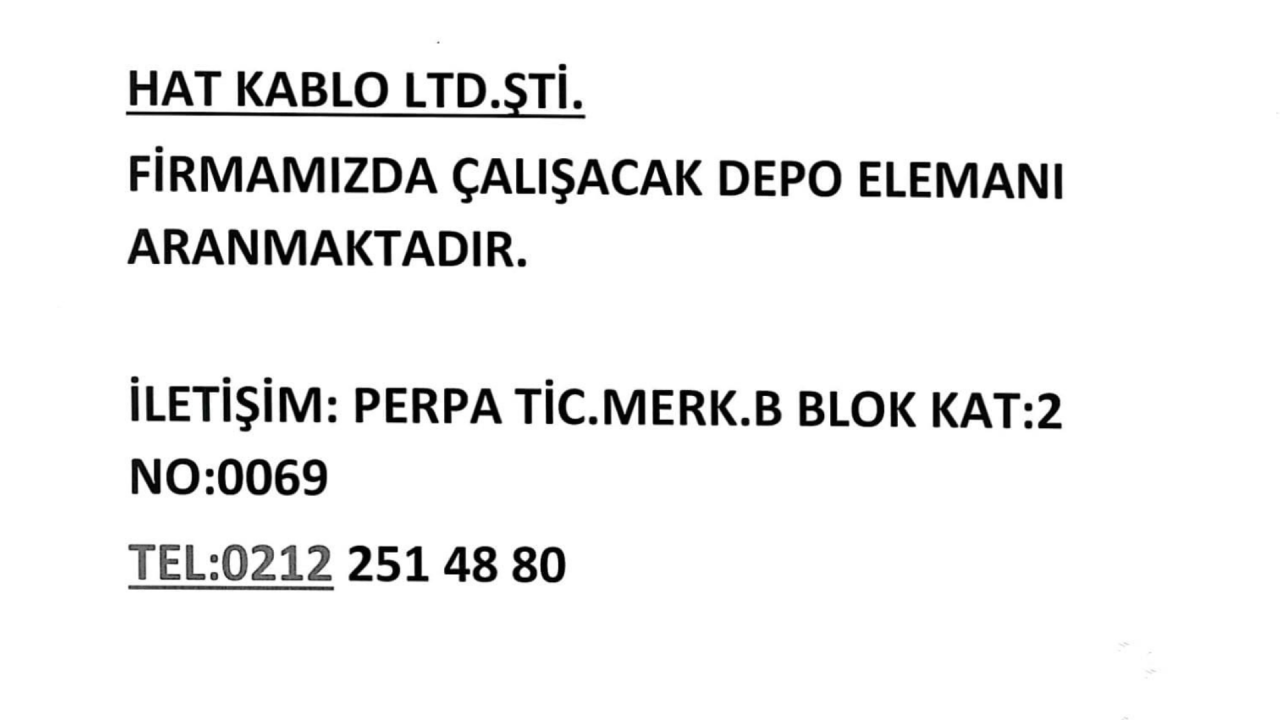 HAT KABLO LTD. ŞTİ. OLARAK FİRMAMIZDA GÖREV ALACAK, DEPO İŞLEMLERİNE HAKİM VE DİNAMİK BİR EKİP ARKADAŞI ARIYORUZ.