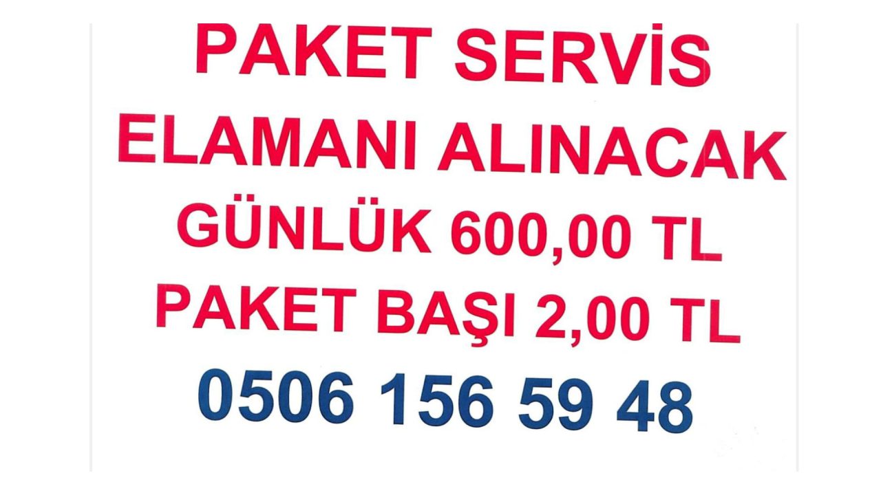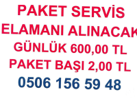PAKET SERVİS ELEMANI OLARAK GÖREV ALACAK KİŞİLER ARANIYORUZ. GÜNLÜK 600 TL MAAŞ VE HER PAKET BAŞINA EK OLARAK 2 TL ÜCRET ÖNERİYORUZ.