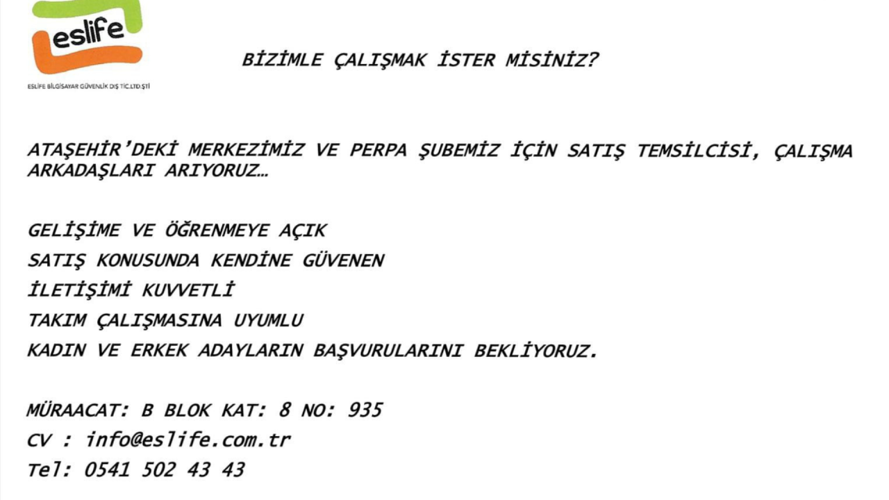 ATAŞEHİR'DEKİ MERKEZİMİZ VE PERPA ŞUBEMİZ İÇİN, GELİŞMEYE VE ÖĞRENMEYE AÇIK, SATIŞ KONUSUNDA DENEYİMLİ, İLETİŞİMİ KUVVETLİ, TAKIM ÇALIŞMASINA UYUMLU KADIN VE ERKEK ADAYLARI ARAMAKTAYIZ. BAŞVURULARINIZI BEKLIYORUZ!