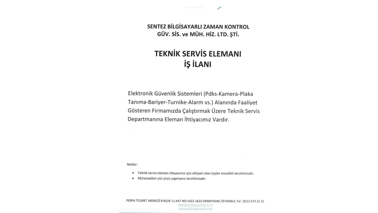 ELEKTORONİK GÜVENLİK SİSTEMLERİ (PDKS-KAMERA-PLAKA TANIMA-BARİYER-TURNİKE-ALARM) ALANINDA FAALİYET GÖSTEREN FİRMAMIZDA ÇALIŞTIRMAK ÜZERE TEKNİK SERVİS DEPARTMANIMIZA ELEMAN İHTİYACIMIZ VARDIR.