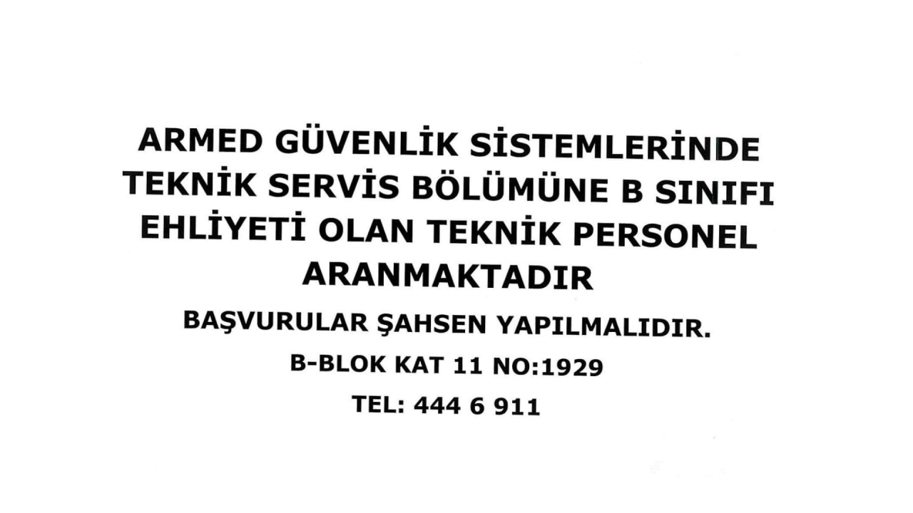 ARMED GÜVENLİK SİSTEMLERİ OLARAK TEKNİK SERVİS BÖLÜMÜMÜZE, B SINIFI EHLİYETİNE SAHİP TEKNİK PERSONEL ARAMAKTAYIZ!