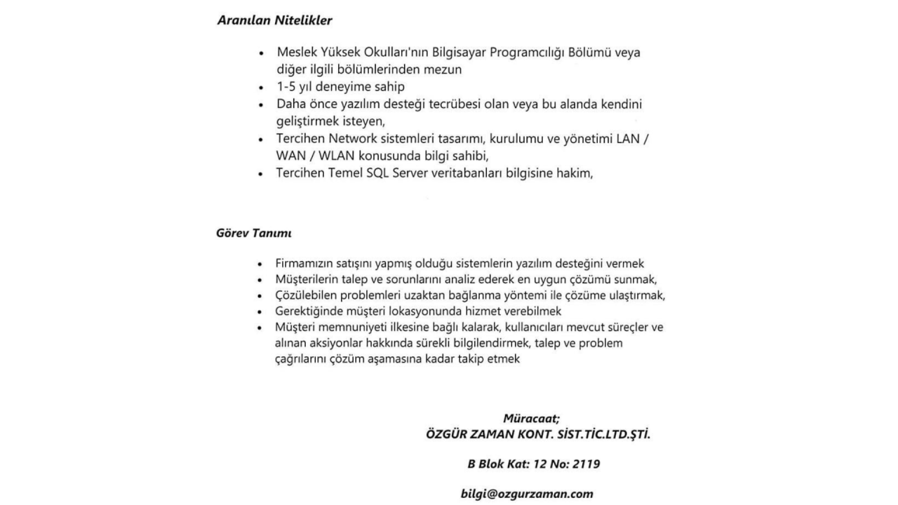 - YAZILIM DESTEĞİ TECRÜBESİ OLAN VEYA BU ALANDA KENDİNİ GELİŞTİRMEK İSTEYEN