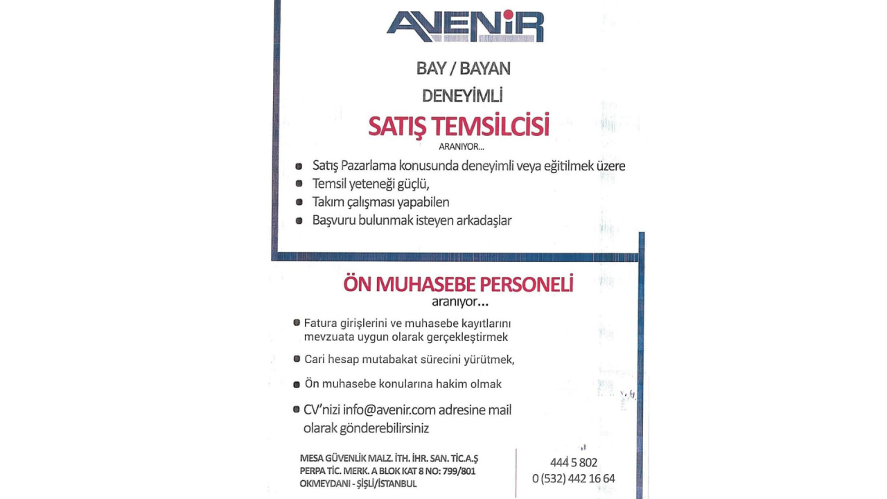 - CV'LERİNİZİ info@avenir.com ADRESİNE GÖNDEREBİLİRSİNİZ.