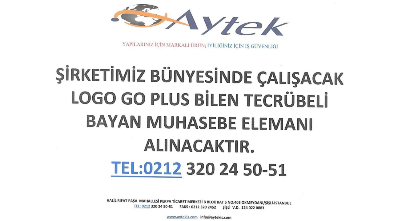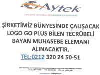 FİRMAMIZA LOGO GO PLUS PROGRAMINI İYİ DERECEDE KULLANABİLEN VE MUHASEBE ALANINDA DENEYİMLİ BAYAN MUHASEBE ELEMANI ARANMAKTADIR. DETAYLI BİLGİ İÇİN LÜTFEN İLETİŞİME GEÇİNİZ.