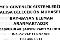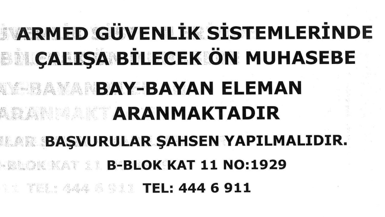 ARMED GÜVENLİK SİSTEMLERİ FİRMAMIZA, ÖN MUHASEBE ALANINDA ÇALIŞABİLECEK, BAY-BAYAN ELEMAN ARANMAKTADIR.