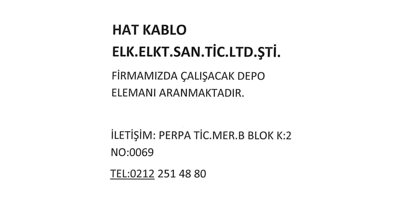 HAT KABLO ELK.ELKT.SAN.TİC.LTD.ŞTİ. OLARAK, DİNAMİK VE PROFESYONEL EKİBİMİZE KATILMAK ÜZERE DEPO ELEMANI ARANIYOR. DEPO ELEMANI OLARAK, FİRMAMIZIN DEPO OPERASYONLARINI DESTEKLEYECEK, DÜZENLİ ÇALIŞMA VE EKİP RUHU İÇİNDE KATKI SAĞLAYACAK ADAYLAR ARANIYOR. İLETİŞİM İÇİN: PERPA TİC. MERK.B BLOK KAT:2 NO:0069, TEL: 0212 251 48 80.
