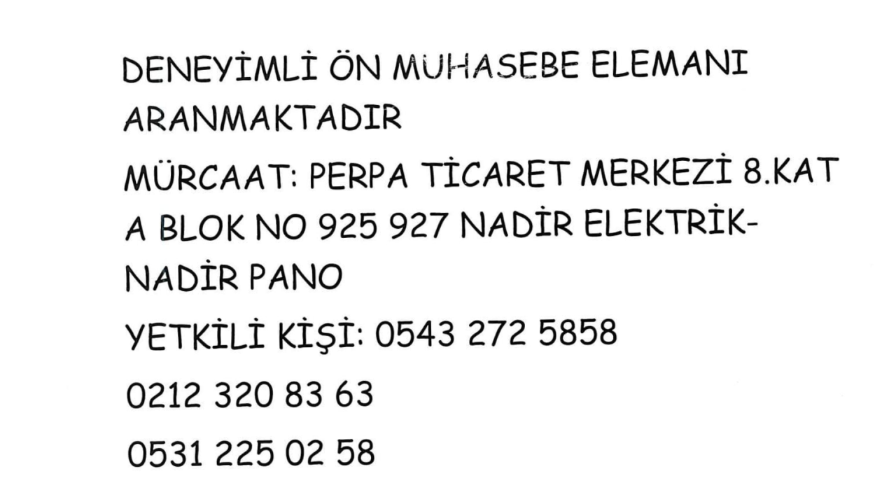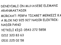 NADİR ELEKTİRİK-NADİR PANO'DA ÇALIŞACAK DENEYİMLİ BİR ÖN MUHASEBE ELEMANI ARANIYOR. DENEYİME SAHİP ADAYLAR TERCİH EDİLECEKTİR.