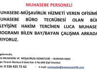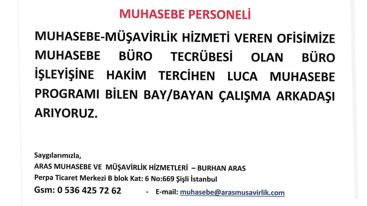 MUHASEBE-MÜŞAVİRLİK HİZMETİ VEREN OFİSİMİZE MUHASEBE BÜRO TECRÜBESİ OLAN, BÜRO İŞLEYİŞİNE HAKİM, TERCİHEN LUCA MUHASEBE PROGRAMINI BİLEN BAY/BAYAN ÇALIŞMA ARKADAŞI ARIYORUZ.