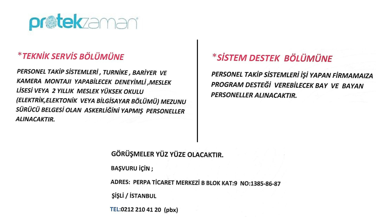 Protek Zaman firması, aşağıdaki pozisyonlar için yeni ekip arkadaşları arıyor: