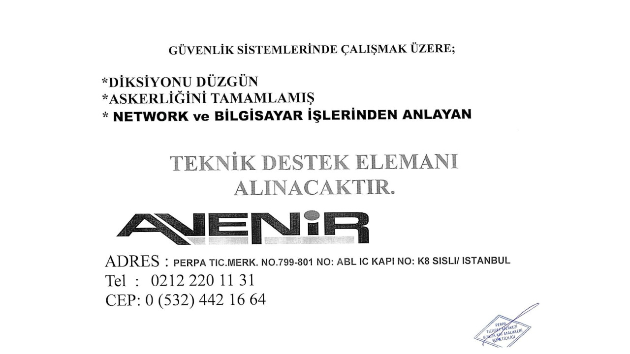 GÜVENLİK SİSTEMLERİNDE ÇALIŞMAK ÜZERE TEKNİK DESTEK ELAMANI ALINACAKTIR