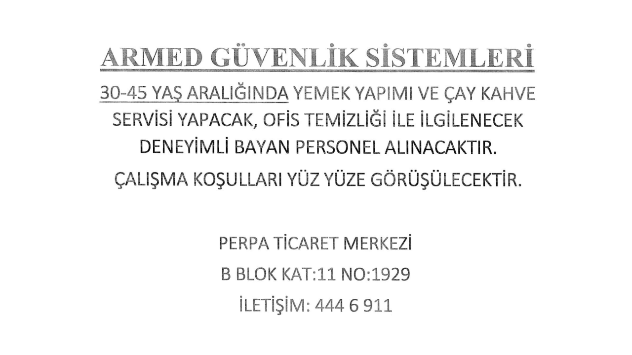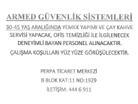 30-45 YAŞ ARALIĞINDA YEMEK YAPIMI VE ÇAY KAHVE SERVİSİ YAPACAK, OFİS TEMİZLİĞİ İLE İLGİLENECEK DENEYİMLİ BAYAN PERSONEL ALINACAKTIR.