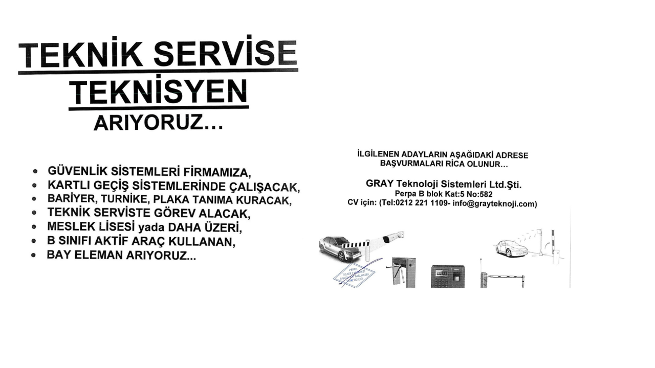 Güvenlik sistemleri alanında faaliyet gösteren GRAY Teknoloji Sistemleri Ltd. Şti., teknik servis departmanında görevlendirilmek üzere teknisyen arayışındadır.