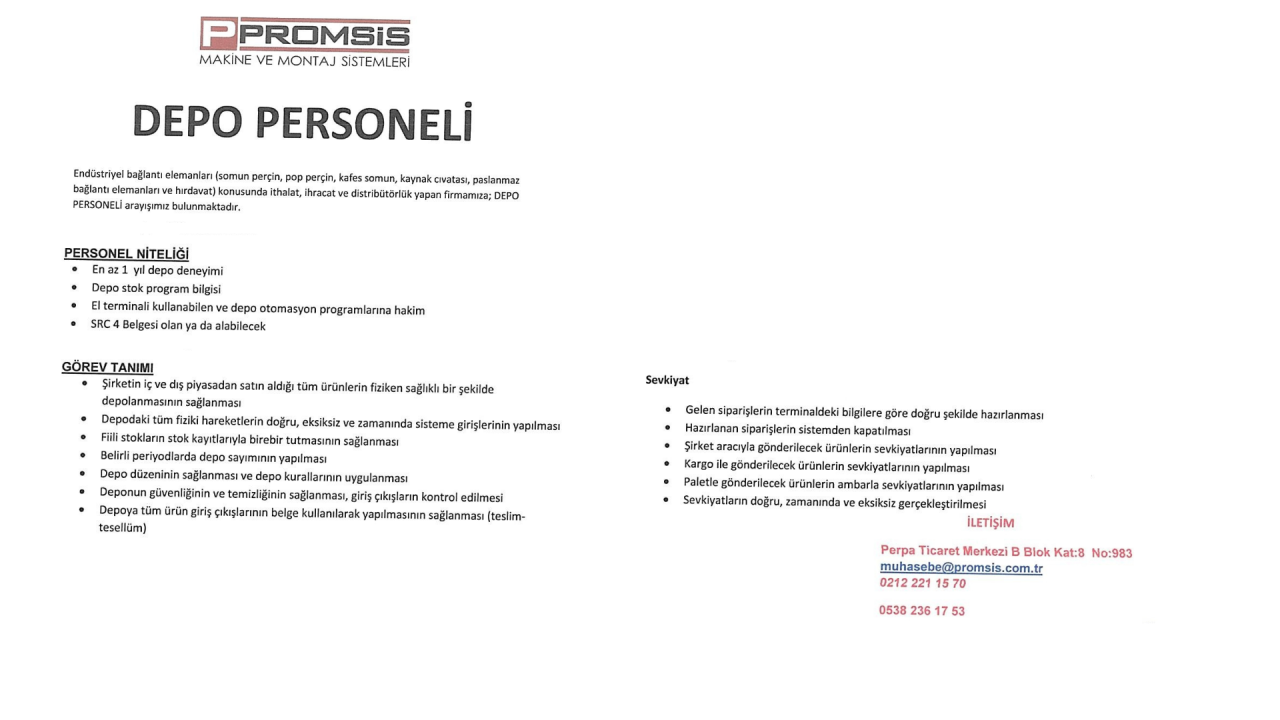 Endüstriyel bağlantı elemanları alanında ithalat, ihracat ve distribütörlük faaliyetleri yürüten Promsis Makine ve Montaj Sistemleri, İstanbul Şişli'deki Perpa Ticaret Merkezi'nde bulunan ofisi için depo personeli arayışındadır.
