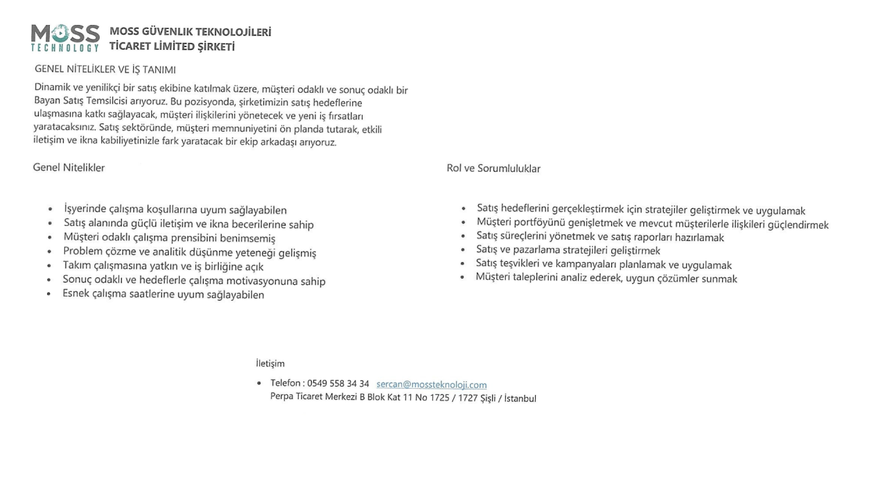 MOSS Güvenlik Teknolojileri Ticaret Ltd. Şti., dinamik ve yenilikçi satış ekibine katılmak üzere bayan satış temsilcisi arıyor. Bu pozisyon, müşteri memnuniyetini ön planda tutan, güçlü iletişim ve ikna becerilerine sahip adaylar için önemli bir kariyer fırsatı sunuyor.