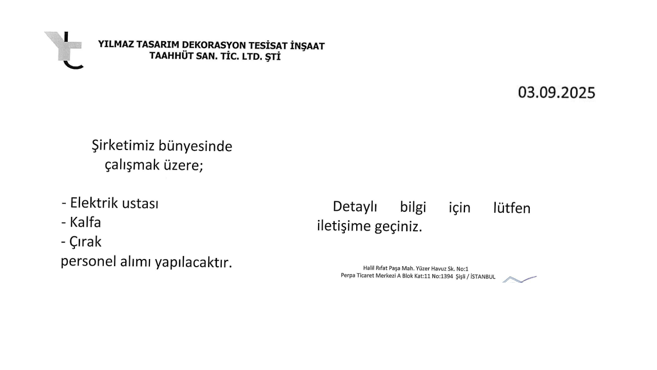 Yılmaz Tasarım Dekorasyon Tesisat İnşaat Taahhüt San. Tic. Ltd. Şti. bünyesinde çalışmak üzere;